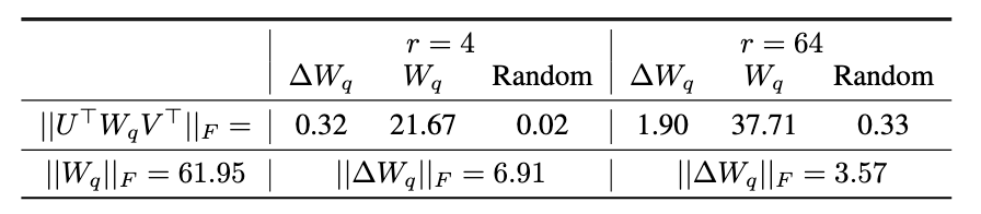 表 7: U ⊤ W q V ⊤ U^\top W_q V^\top U⊤WqV⊤ 的 Frobenius 范数,其中 U U U 和 V V V 是 (1) Δ W q \Delta W_q ΔWq、(2) W q W_q Wq 或 (3) 随机矩阵的左/右前 r r r 个奇异向量方向。权重矩阵取自 GPT-3 的第 48 层。
