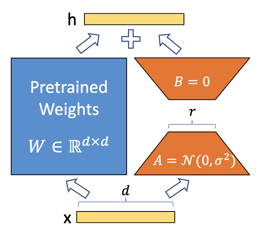 h = W 0 x + Δ W x = W 0 x + B A x ( 3 ) h = W_0x + \Delta W x = W_0x + BAx \quad (3) h=W0x+ΔWx=W0x+BAx(3)