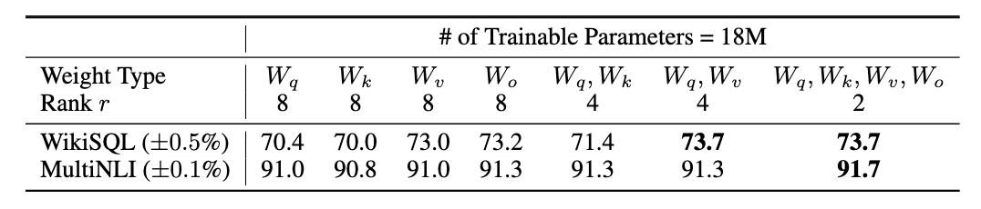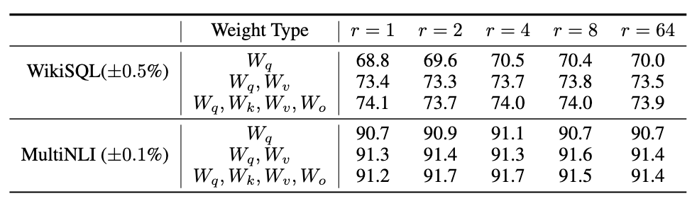 表 5:在给定相同数量的可训练参数的情况下,在 GPT-3 中对不同类型的注意力权重应用 LoRA 后,WikiSQL 和 MultiNLI 上的验证准确率。同时调整 W q W_q Wq 和 W v W_v Wv 总体上能获得最佳性能。论文发现对于给定数据集,跨随机种子的标准差是一致的,论文将其报告在第一列中。