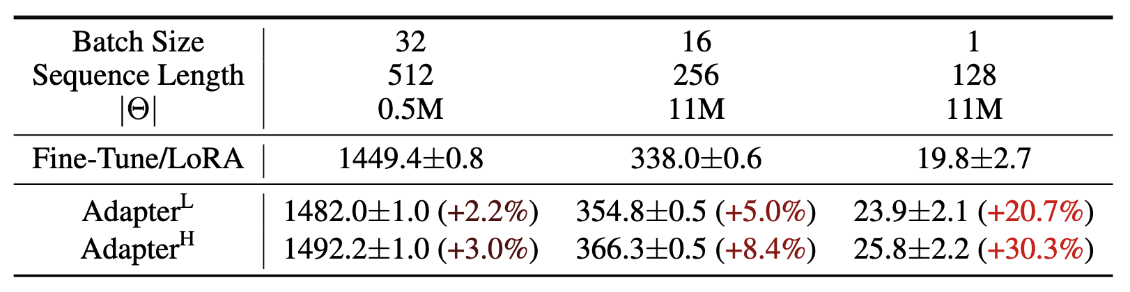 当需要像Shoeybi等人(2020)或Lepikhin等人(2020)那样对模型进行分片时,这个问题会变得更加严重,因为除非多次冗余地存储适配器参数,否则额外的深度需要更多的同步GPU操作,例如AllReduce和Broadcast。