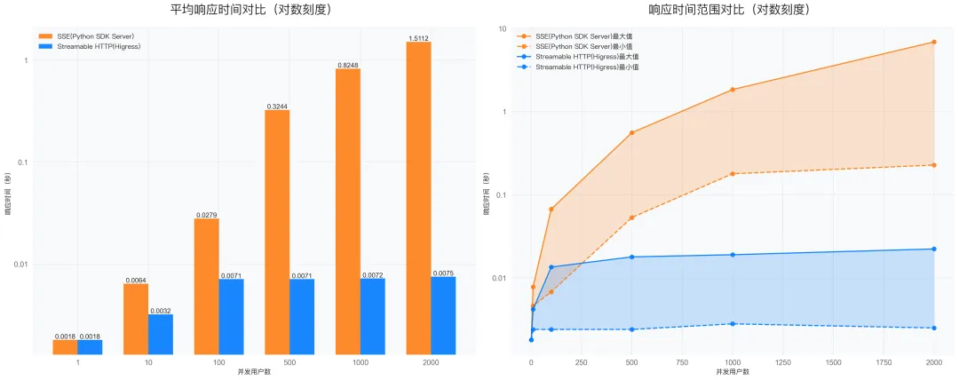 性能测试结果显示,Higress 部署的 Streamable HTTP 在响应时间方面具有明显优势: