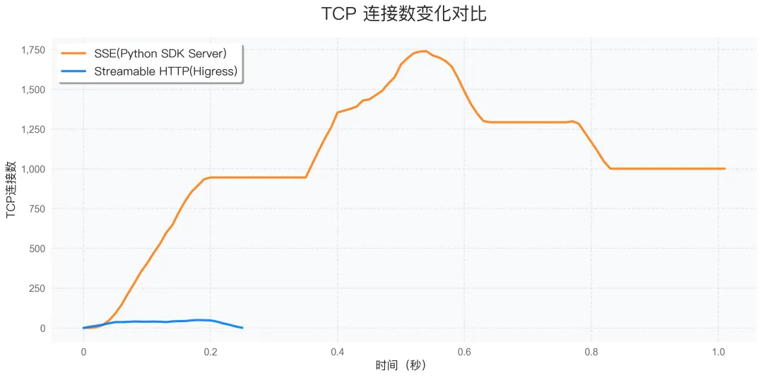 在 1000 个并发用户的测试场景下,Higress 部署的 Streamable HTTP 方案的 TCP 连接数明显低于 HTTP + SSE 方案: