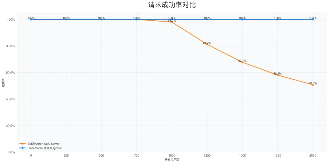 - Streamable HTTP:即使在高并发场景下仍能保持较高的请求成功率
