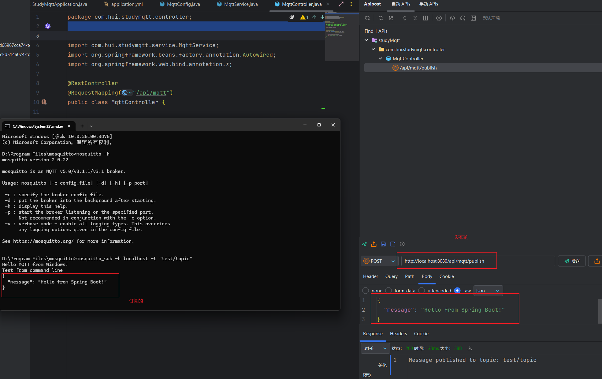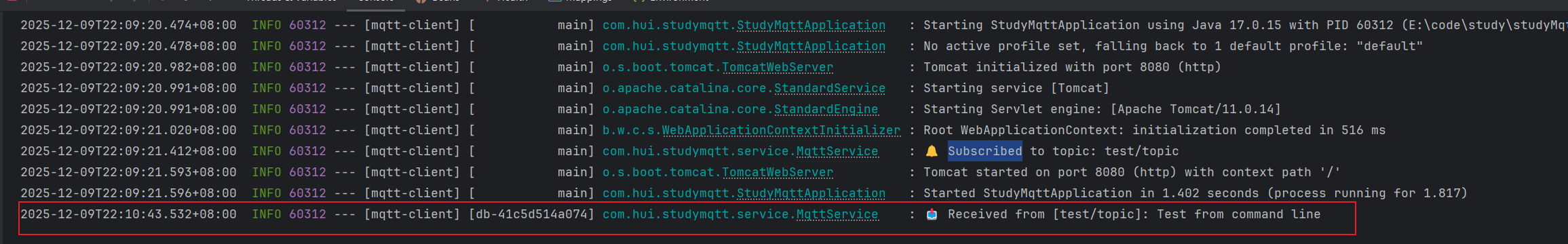 确保 Mosquitto 服务正在运行(通过 services.msc 确认),然后启动 Spring Boot 项目。