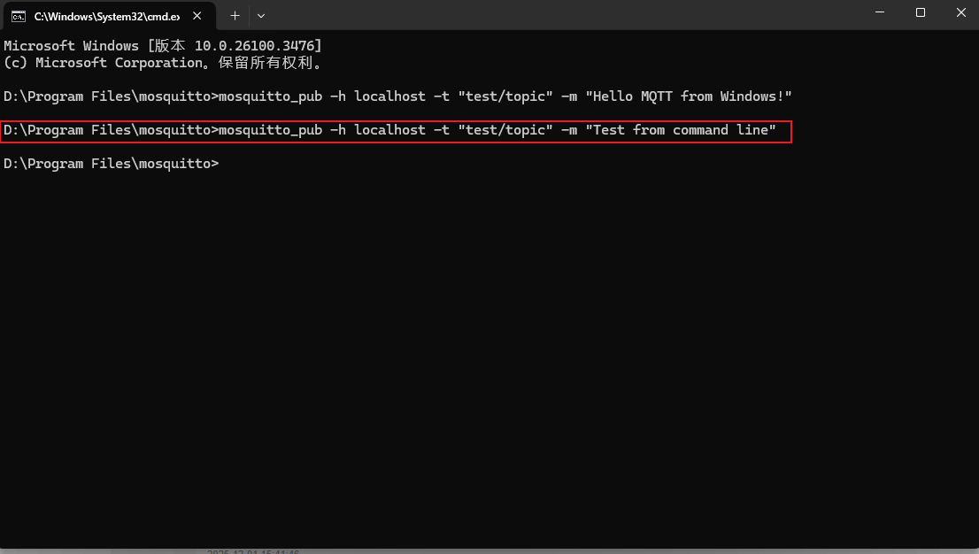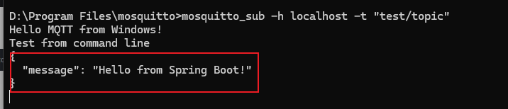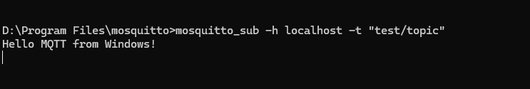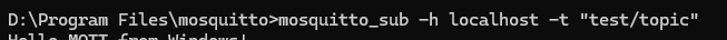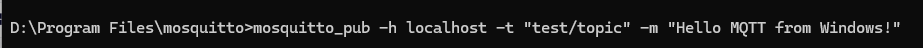 mosquitto_pub -h localhost -t "test/topic" -m "Hello MQTT from Windows!"