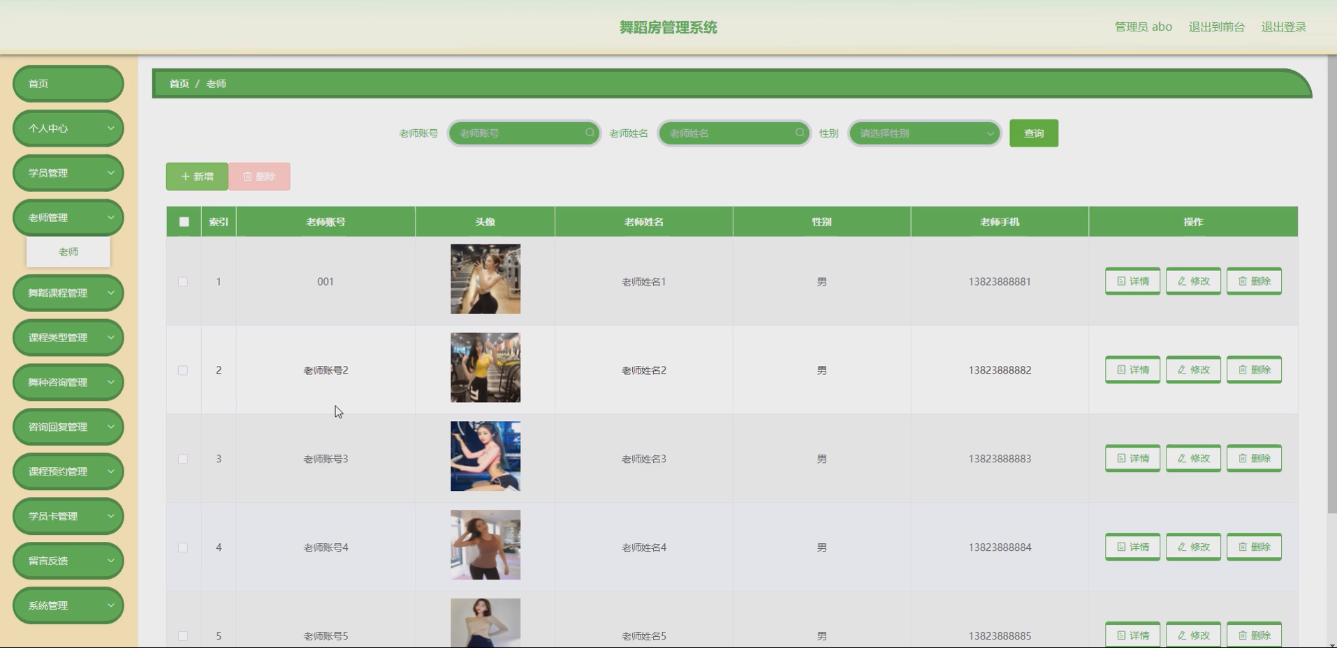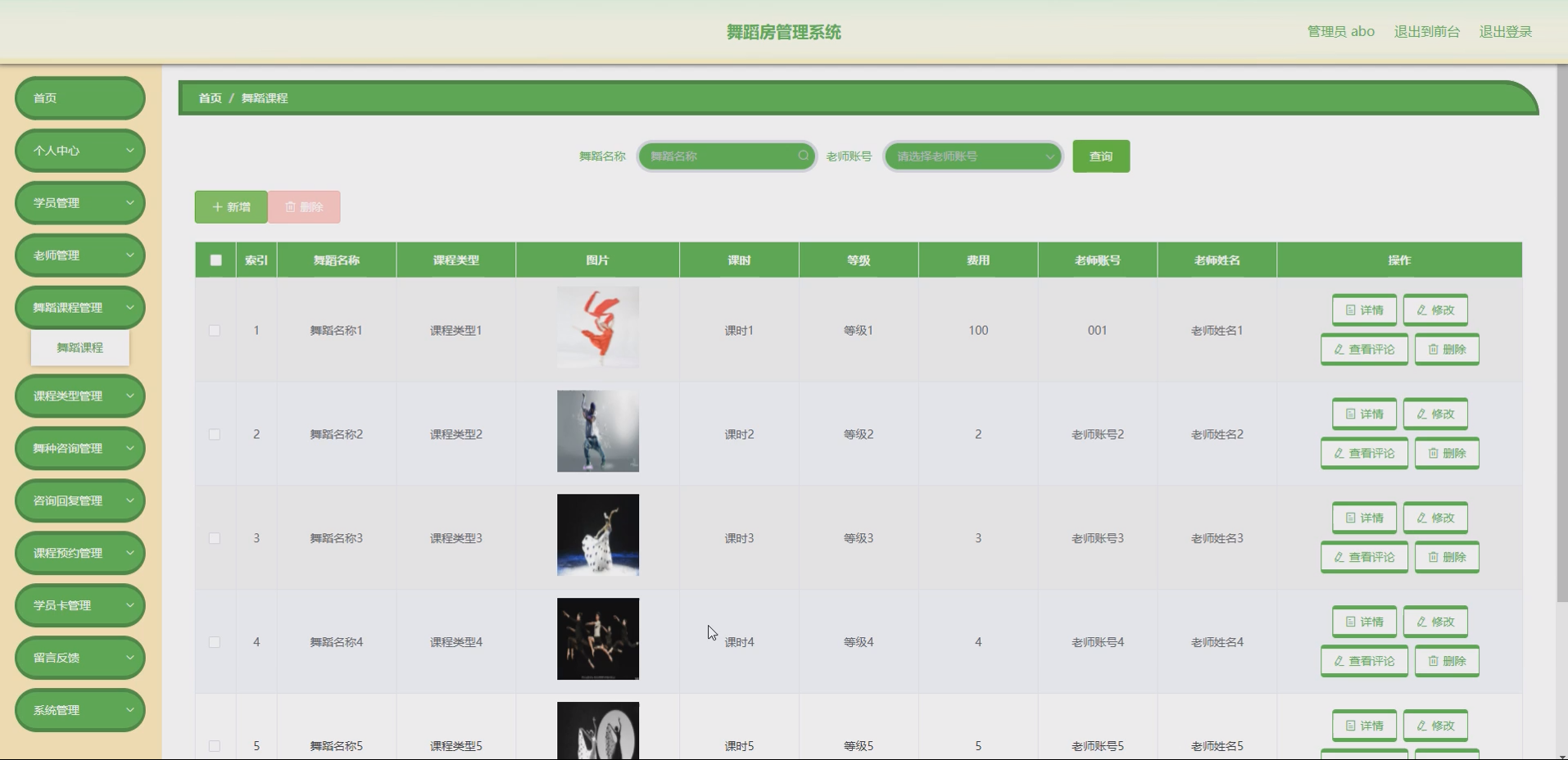 SSM舞蹈房管理系统1套:实现学员管理、老师管理、舞蹈课程管理、课程类型管理、舞种咨询、咨询回复、课程预约、学员卡管理等核心功能,满足舞蹈房日常运营管理需求,支持多角色登录与操作。