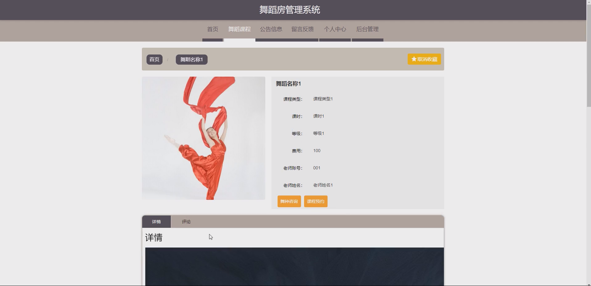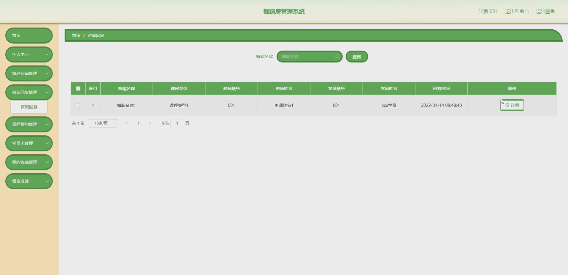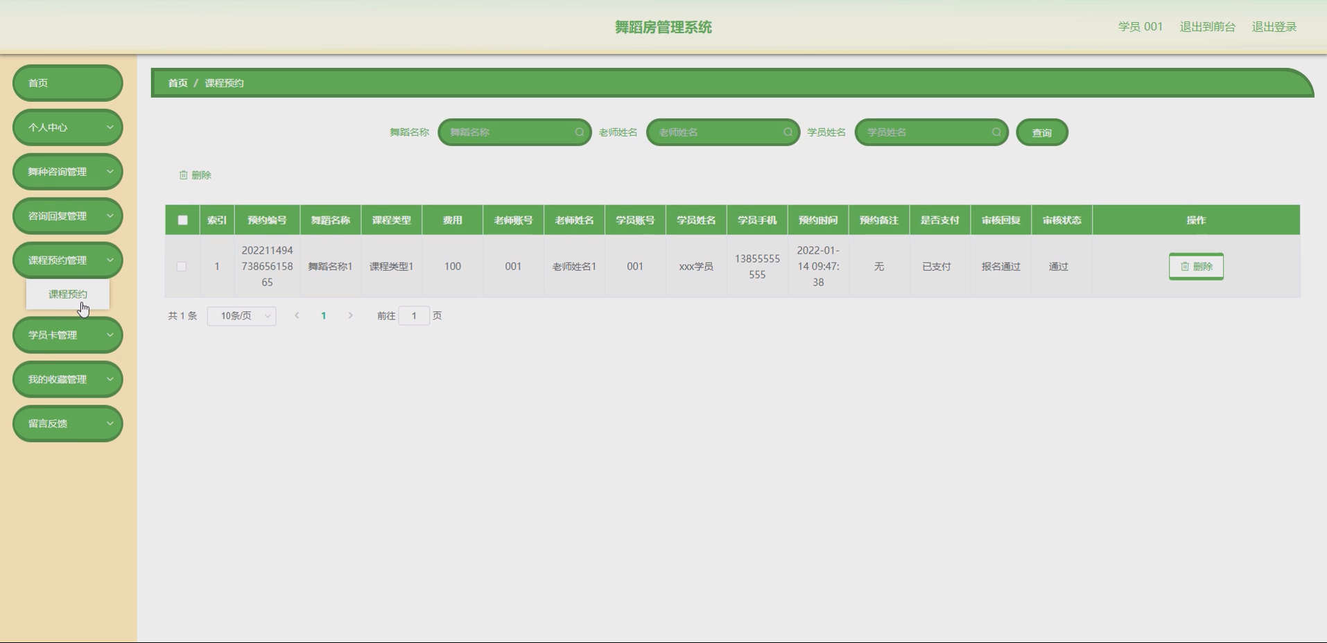 系统项目功能:学员,老师,舞蹈课程,课程类型,舞种咨询,咨询回复,课程预约,学员卡