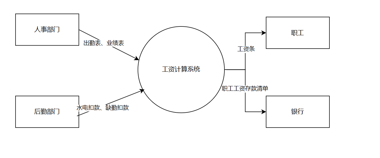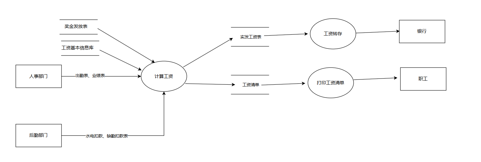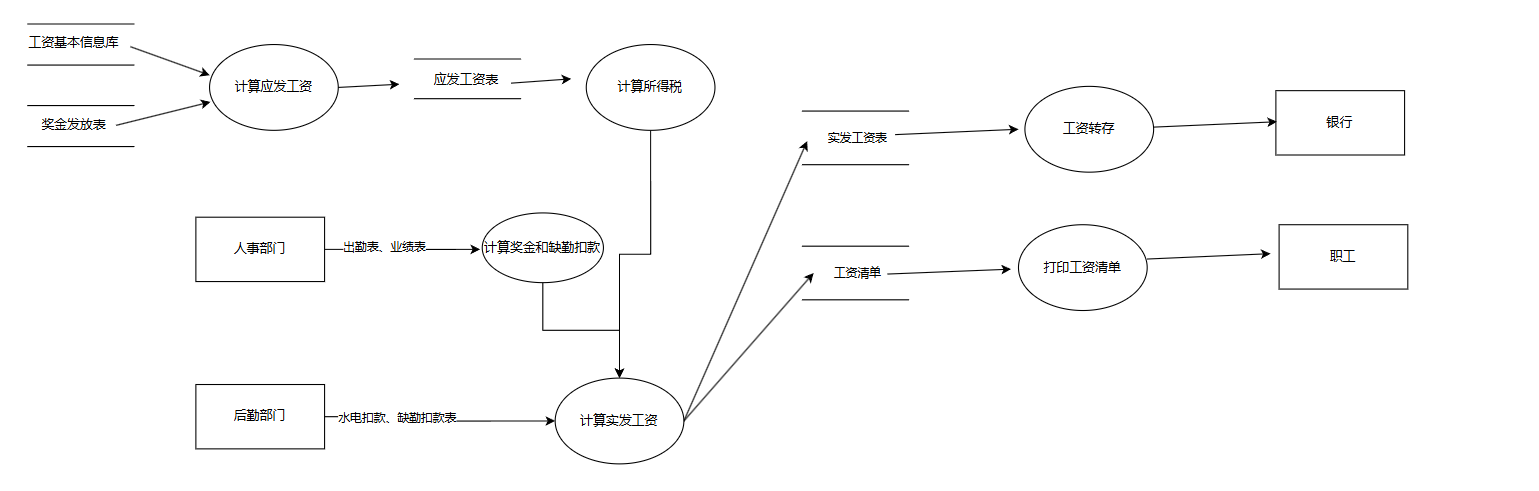 根据人事部门给出的出勤表和业绩表计算奖金和缺勤扣款,通过生成的奖金发放表及工资基本信息库的信息计算应发工资,根据应发工资表计算所得税,根据后勤部门给出的水电扣款及缺勤扣款表和所 得税款计算出实发工资,最后生成实发工资表和工资清单。