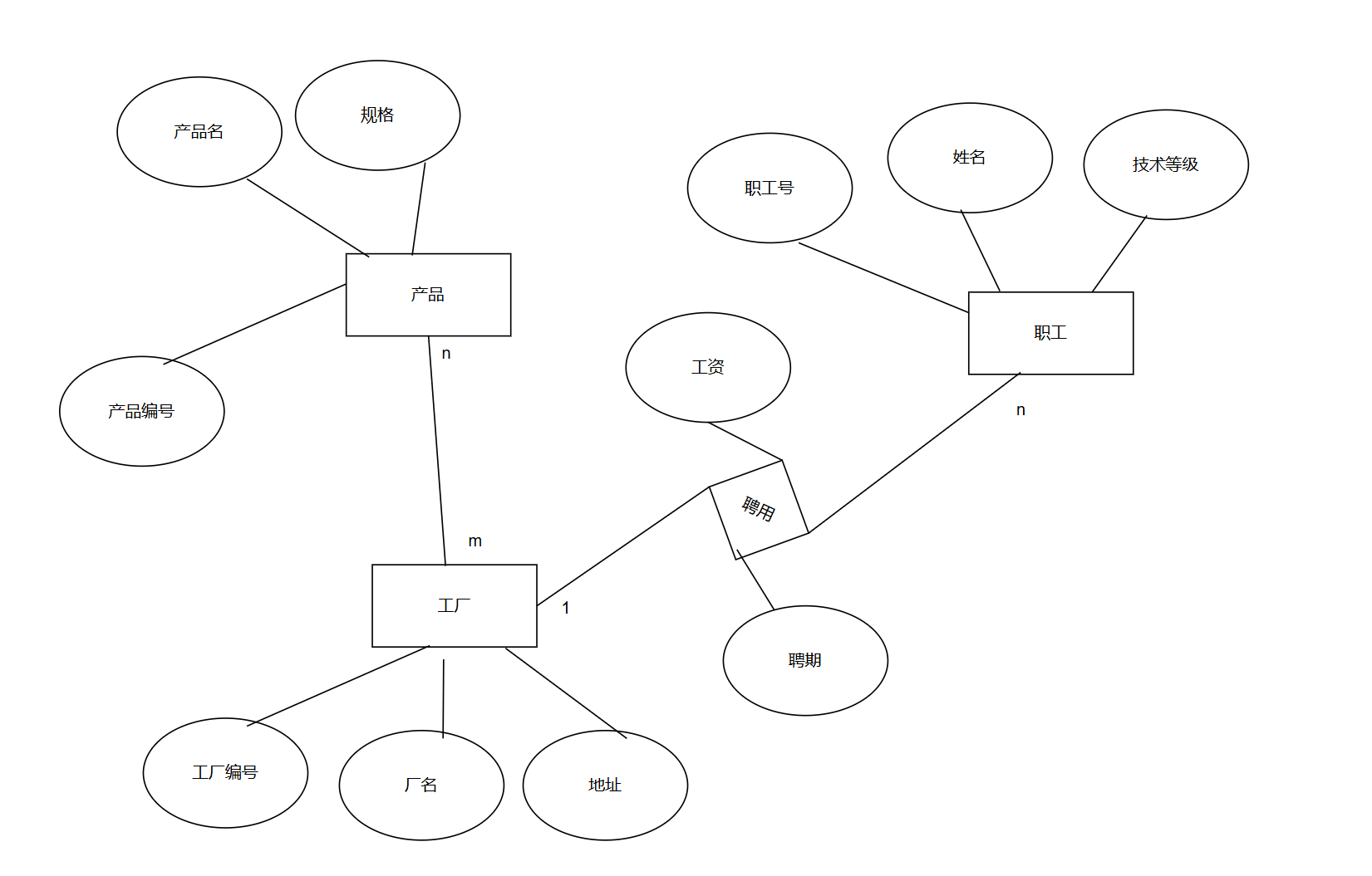 3.某企业集团有若干工厂,每个工厂生产多种产品,且每一种产品可 以在多个工厂生产,每个工厂按照固定的计划数量生产产品,计划数量 不低于300;每个工厂聘用多名职工,且每名职工只能在一个工厂工作, 工厂聘用职工有聘期和工资。工厂的属性有工厂编号、厂名和地址,产 品的属性有产品编号、产品名和规格,职工的属性有职工号、姓名和技 术等级。