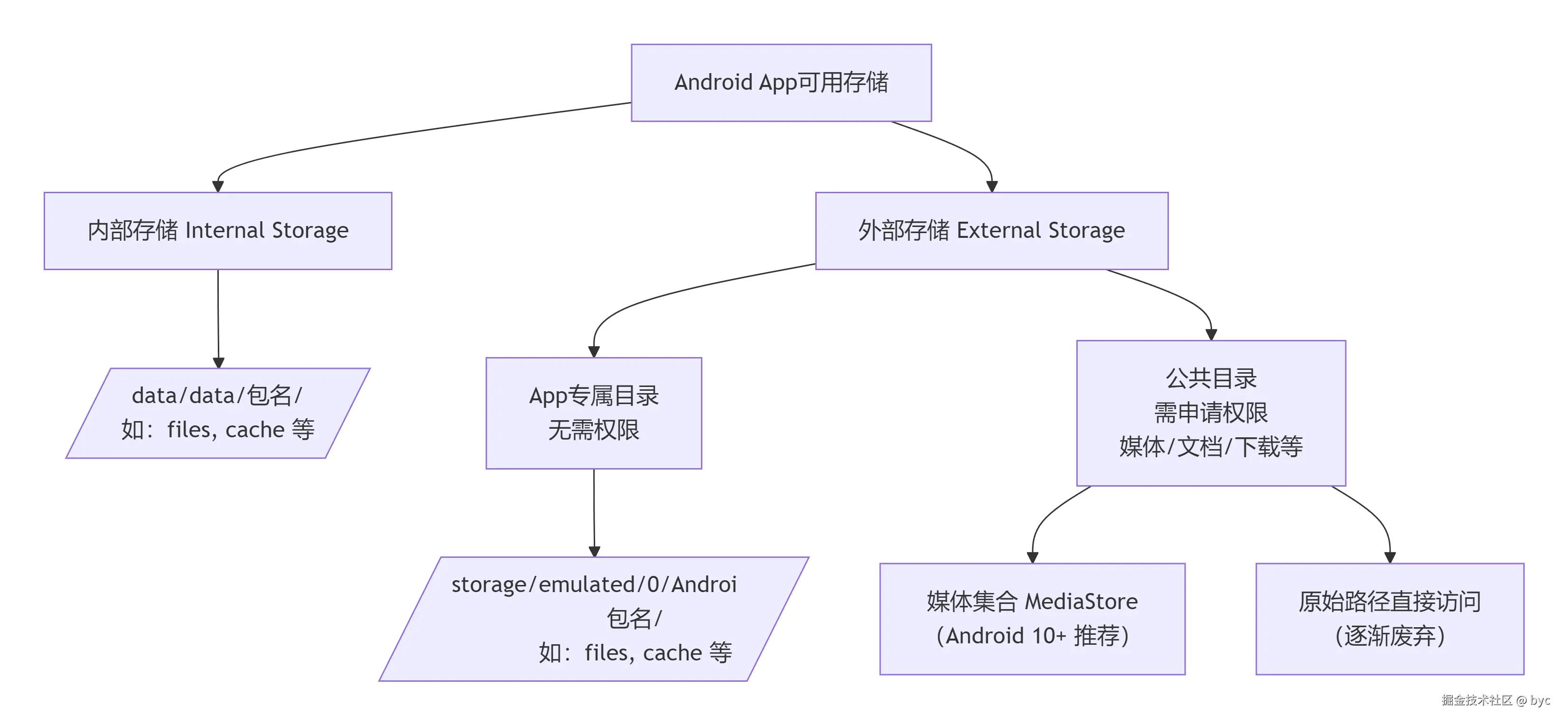 | Internal Storage | 内部存储 | 完全不受影响 | 始终私有,无需任何权限访问 |