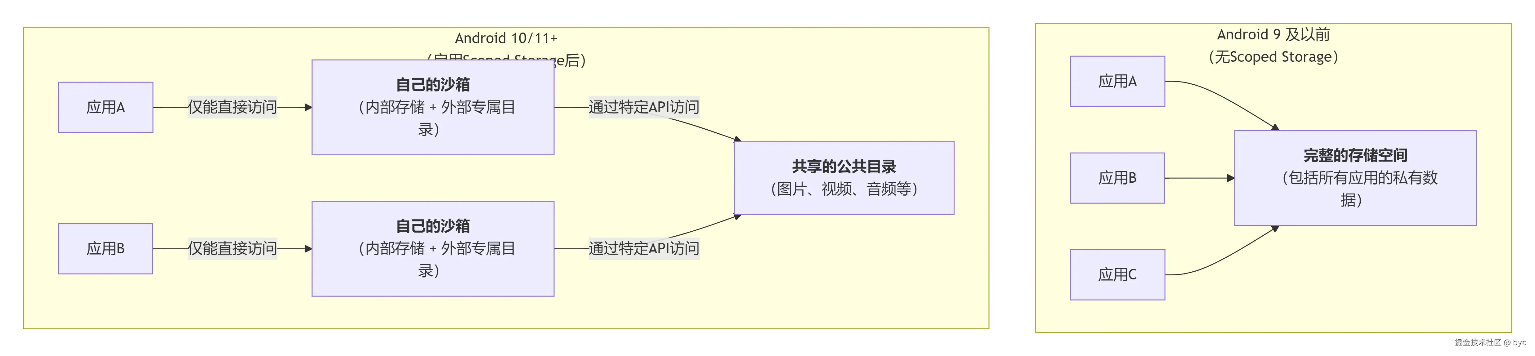 为了更直观地展示Scoped Storage如何改变了应用访问存储的"视野",你可以参考下面的对比图: