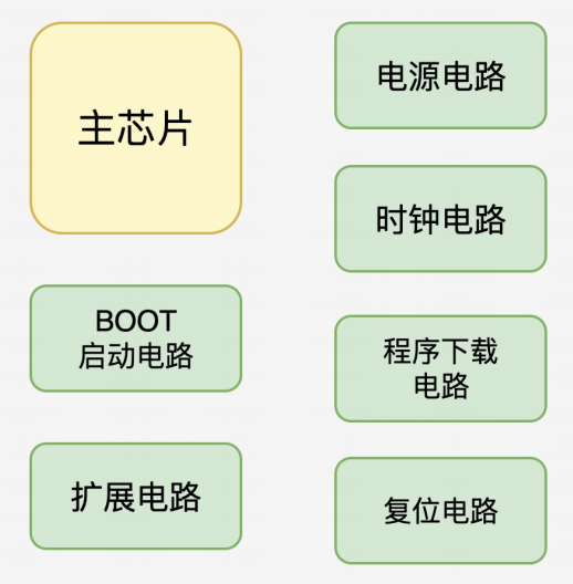 它是一种基本的单片机应用系统,通常由主芯片,时钟电路,复位电路,电源电路,BOOT启动电路,程序****下载电路,扩展接口组成,为单片机提供时钟信号、复位信号以及外设接口等必要功能。