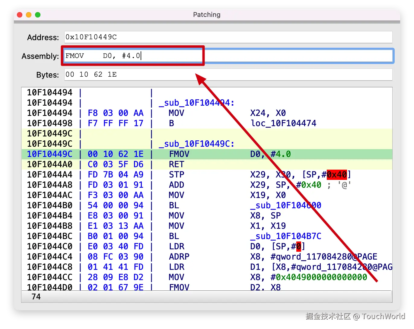 sub_10F10449C方法的前两条汇编指令,改为下面