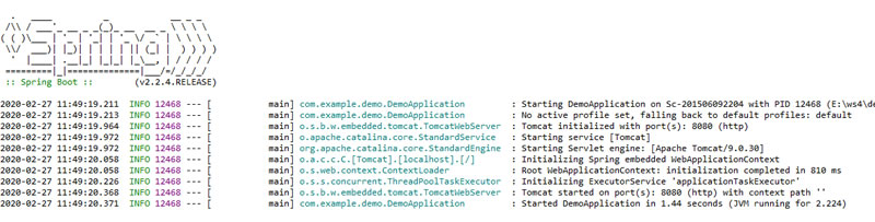 - 右键工程菜单,选择 Run As->Spring Boot App,运行项目。日志如下图: