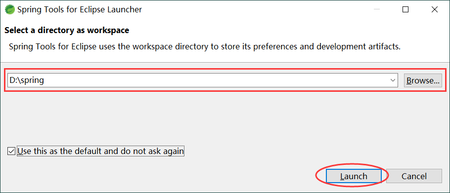 - 双击 SpringToolSuite4.exe 启动,选择工作空间目录,然后点击 "Launch":