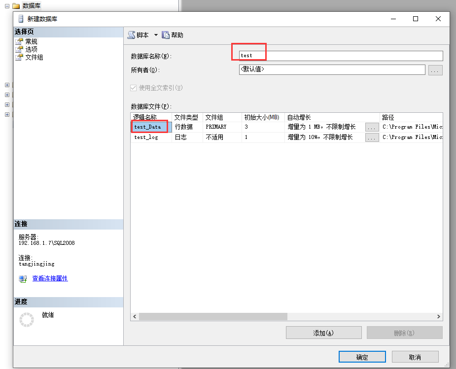 1、新建一个同名的数据库test,并且主数据文件名要一致,如图: