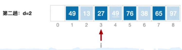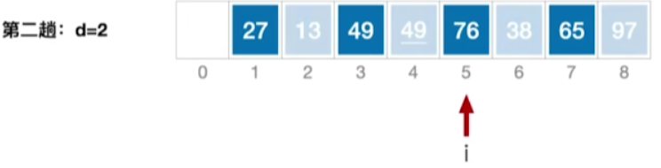 第二趟的处理我们会缩小这个增量d的值, d 2 = d 1 / 2 = 2 d_2 = d_1 / 2 = 2 d2=d1/2=2,因此第二趟的处理当中,我们会把相距距离为2的那些元素划分为同一个子表,如:49,27,76和65为同一个子表