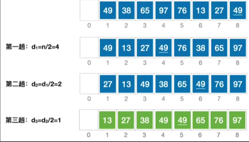 接下来再缩小d的值, d 3 = d 2 / 2 = 1 d_3 = d_2 / 2 = 1 d3=d2/2=1,此时相当与对整个数组进行插入排序.(整个表已呈现出"基本有序 ",对整体再进行一次"直接插入排序",由此可降低直接插入排序的时间复杂度)