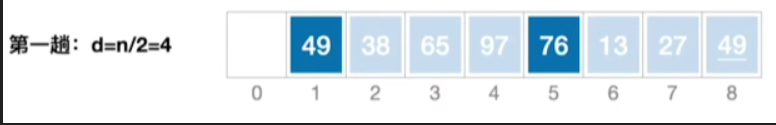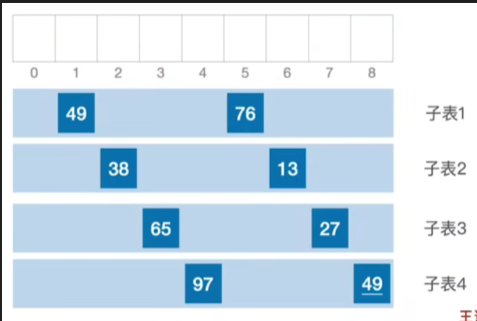 假设我们第一趟的排序,设定这个增量 d 1 = n / 2 = 4 d_1 = n / 2 = 4 d1=n/2=4,所有的相距距离为d的这些元素我们都会把它看作是属于同一个子表的元素,如:49和76;38和13,列出所有子表如下: