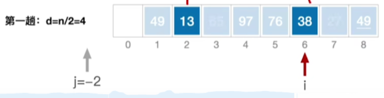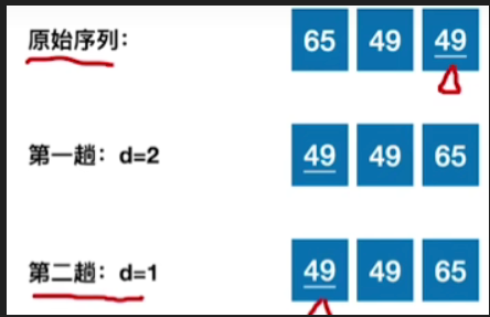 - 值得注意的是:这里的算法思路在处理第二趟的元素时和我们的之直接插入排序略有不同