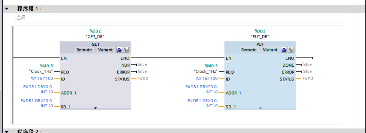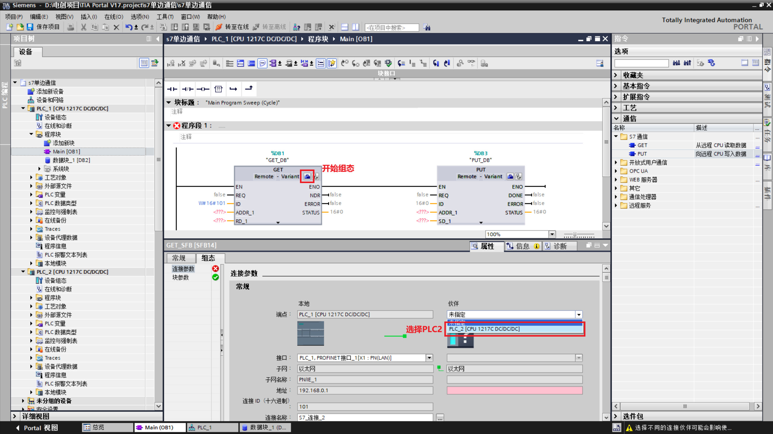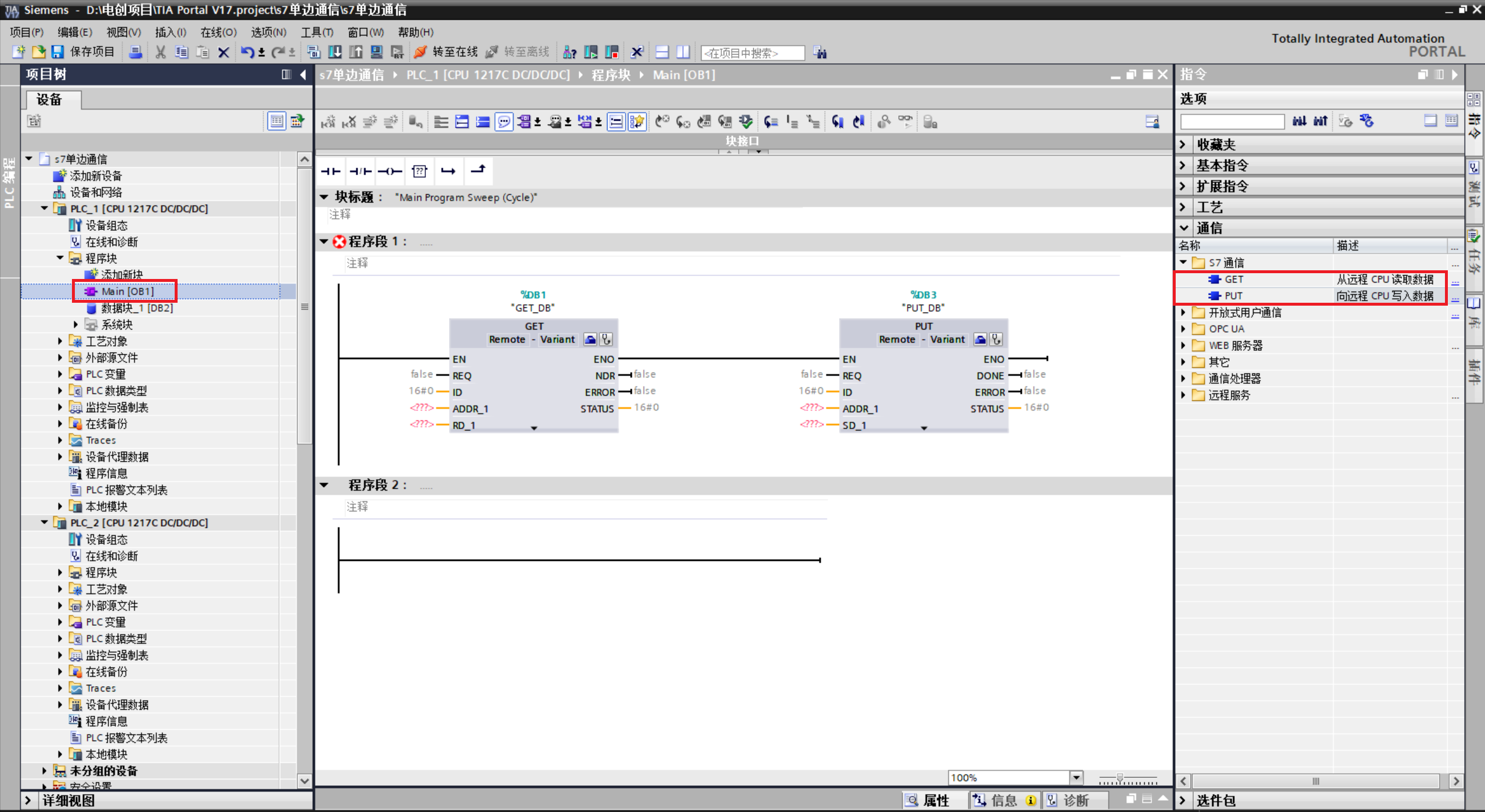 7.打开主程序,从指令列表中,找到"通信" → "S7通信" → **GET和PUT,**把这两个块托进程序段