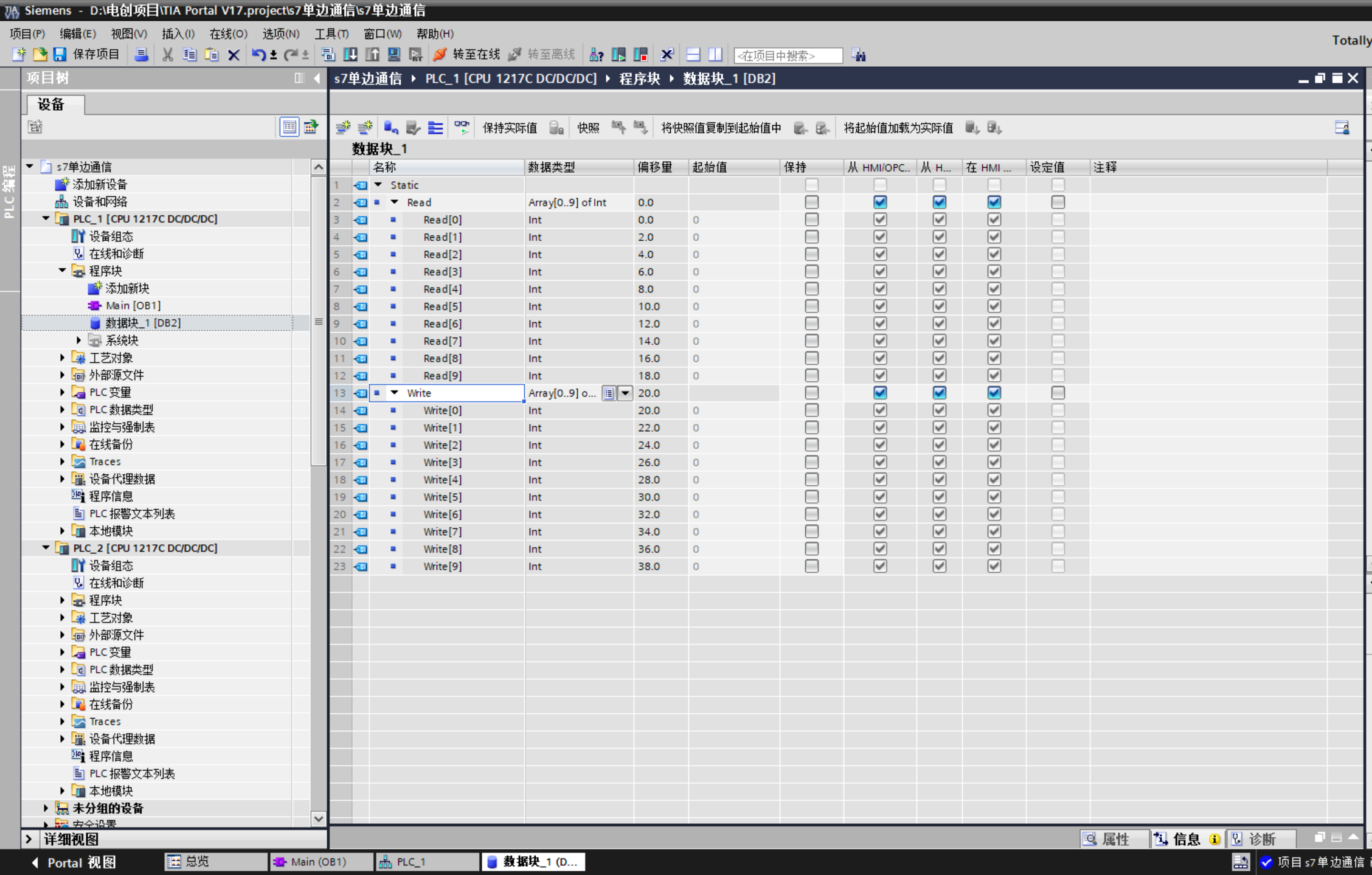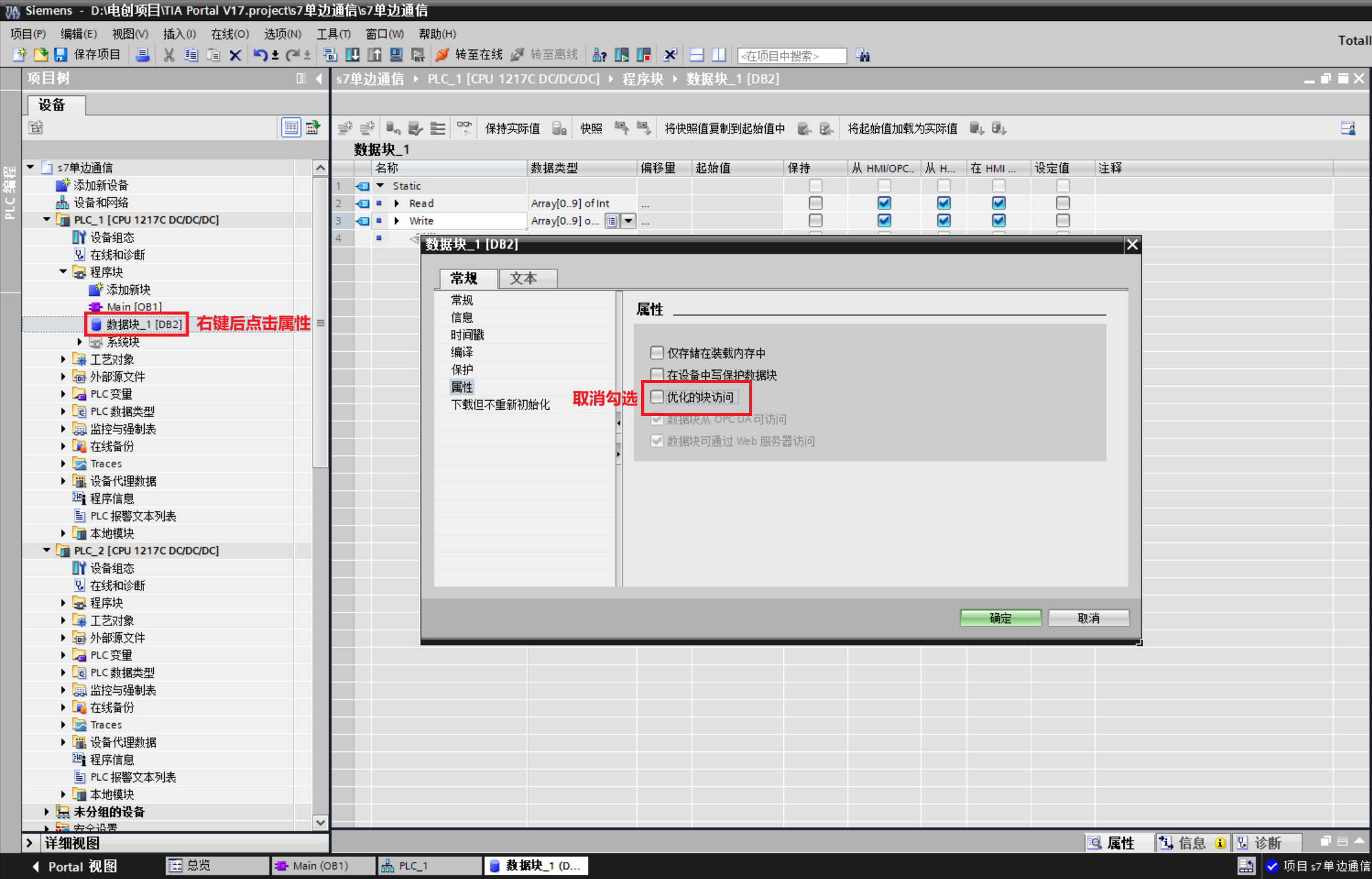 6.创建数据块,在DB1中定义变量 (必须取消勾选"优化的块访问")