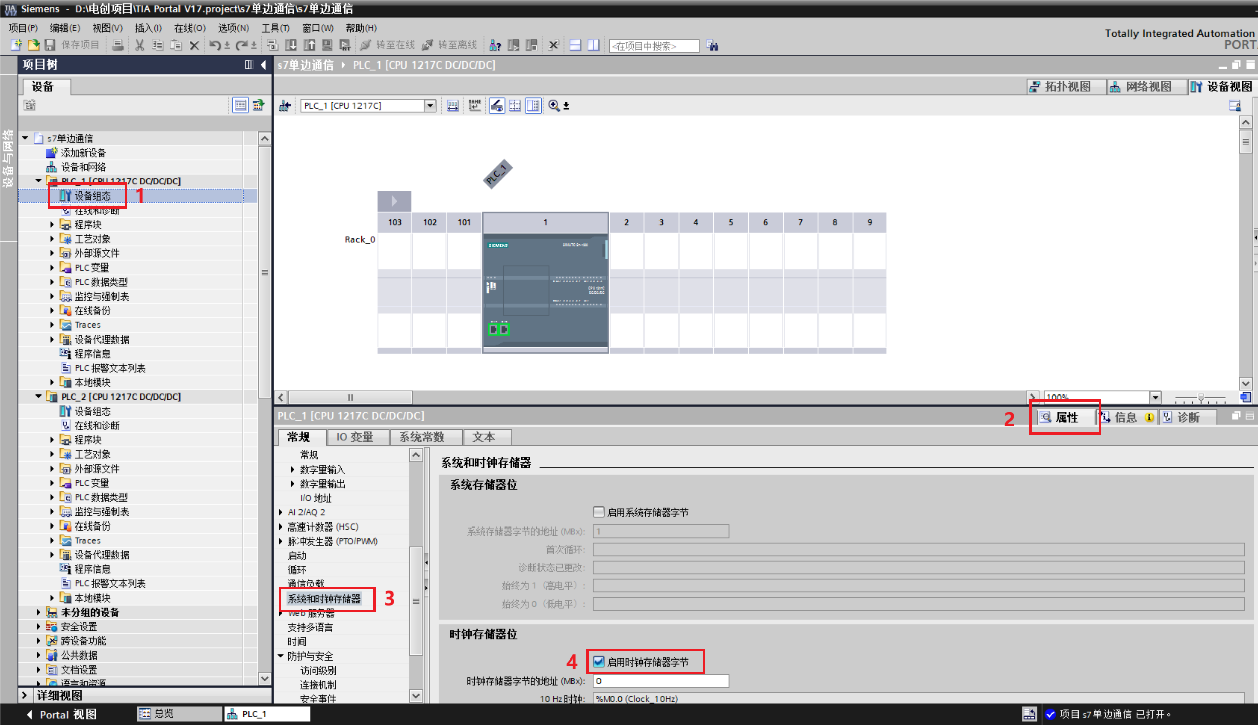 5.点击PLC1的"设备组态"在"系统和时钟储存器"中勾选"启用时钟存储字节"