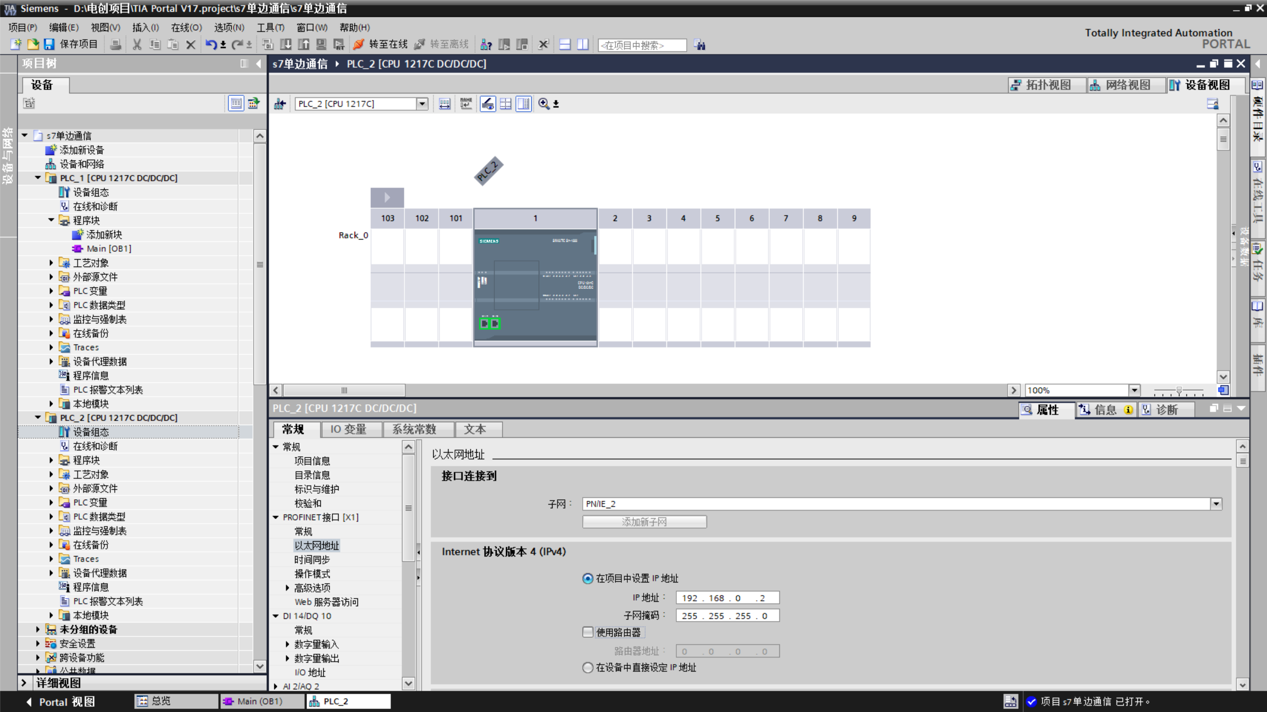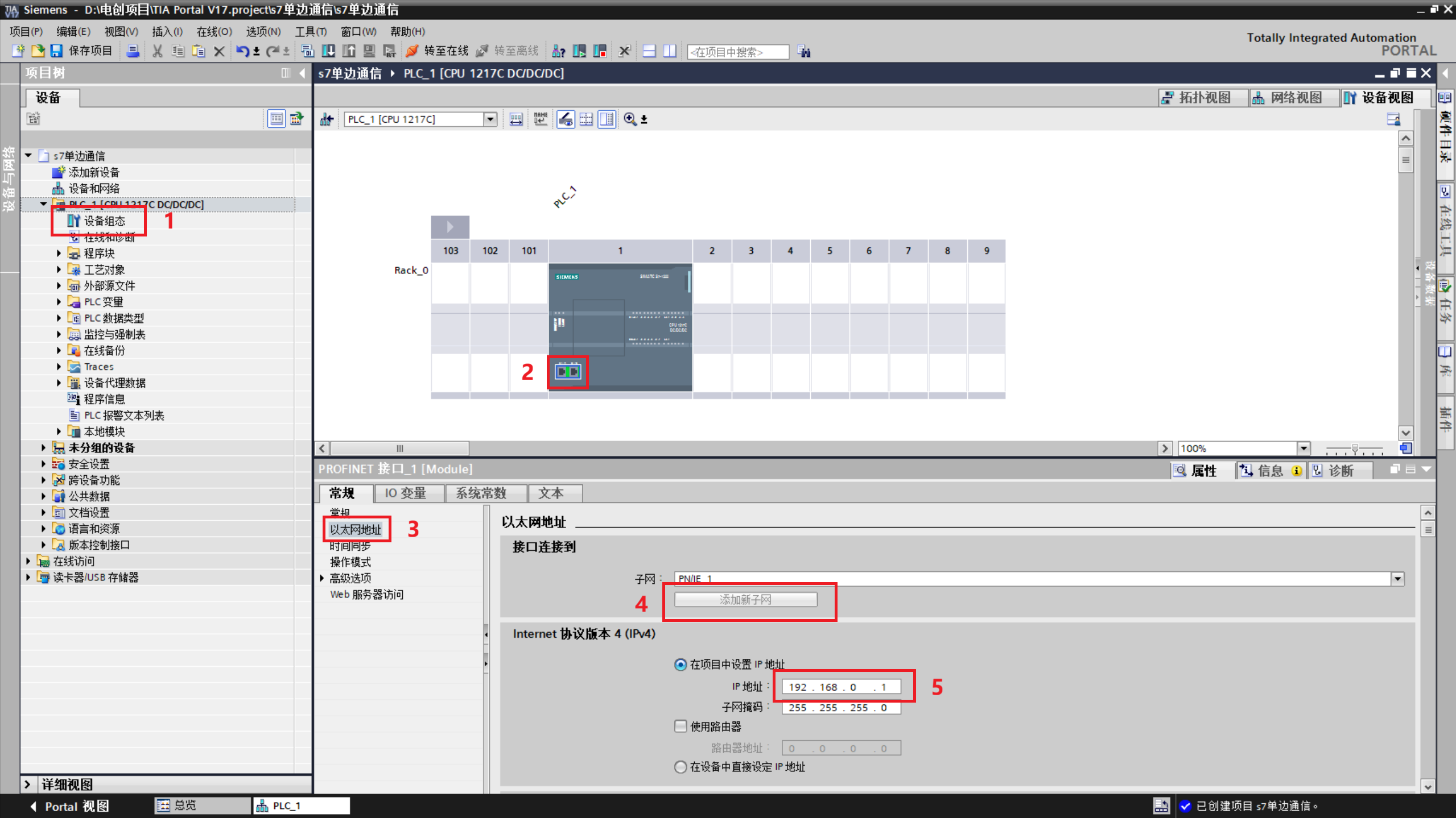 1.使用 TIA Portal 创建一个新项目,组态第一台 1217 CPU,并设置 IP 地址,如图所示。