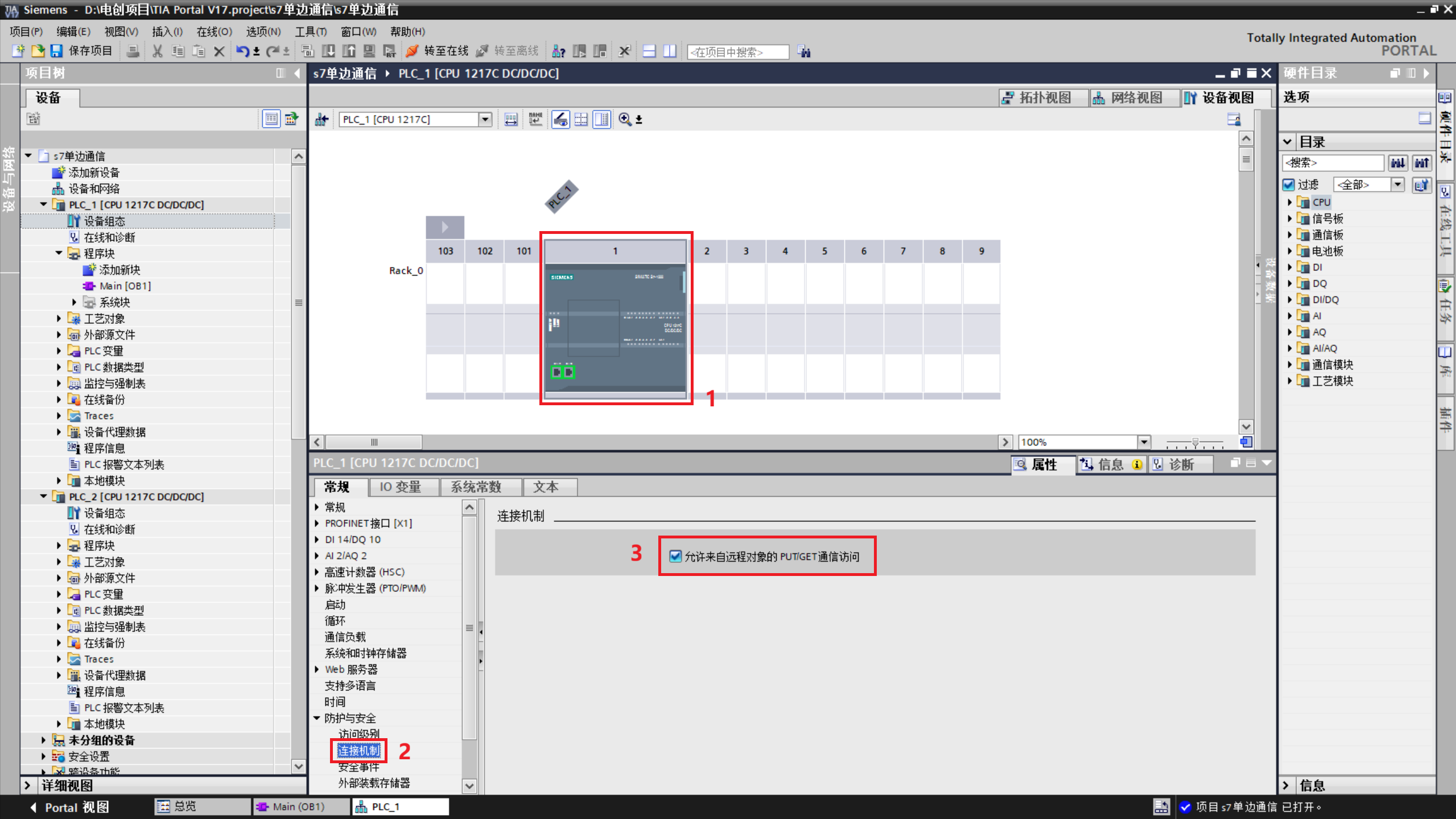 2.点击PLC在"连接机制"中勾选上"允许来自远程对象的PUT/GET通信访问"