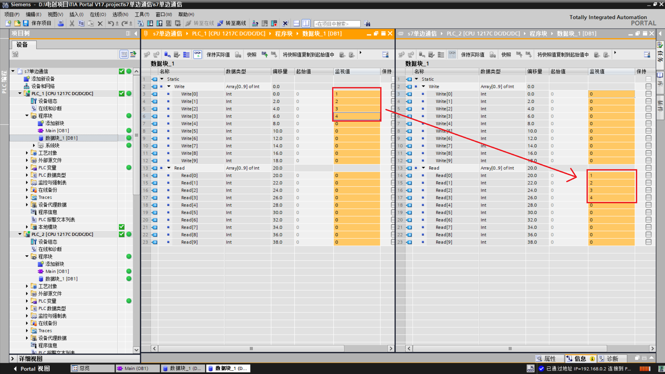 当我在 PLC_1 的 Write[0] 中输入数值"1"时,PLC_2 的 Read[0] 成功接收到了该值
