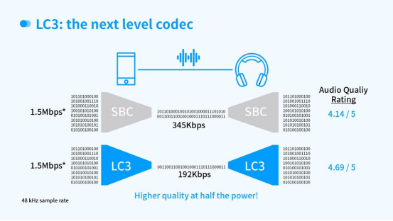 LC3拥有更高的压缩比,在通用的48K/16bit/立体声数据上,LC3可以做到8:1的高保真压缩率(96kbps),SBC在同等数据上通常是328kbps。