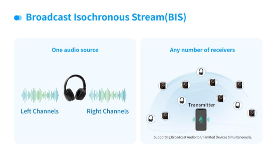 广播音频功能,使音频源设备能够向无限数量的音频接收器设备广播一个或多个音频流。BIS模式是LE Audio主要的应用创新点,其基于Auracast广播音频规范,实现了一主任意从的音频传输模式,并因为ISO的加入,使每个从端都可以做到音频同步播放。经典蓝牙技术通常用于个人设备连接,例如将智能手机连接到无线耳机,而 BIS主要设计用于公共音频广播场景,例如听众可以在餐厅收听无声电视、收听机场公共广播。同时,它支持同一个广播多条音频流,可以选择收听指定的流,例如在电影院观看电影,可以选择指定的语言收听,而不需要分开播放。BIS是单向的,同时节省了大量的数据交互,可以把功耗做到很低,一对N的特性可以做到很多之前做不到的事情。