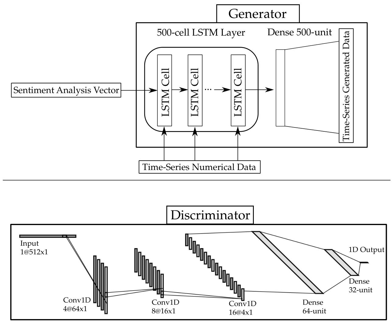 创新性融合自然语言处理(NLP)的情感分析结果与金融数值数据,基于生成对抗网络(GAN)构建时序预测模型,解决"文本与数值特征有效结合"及"稀疏/低相关金融数据学习"两大核心挑战。