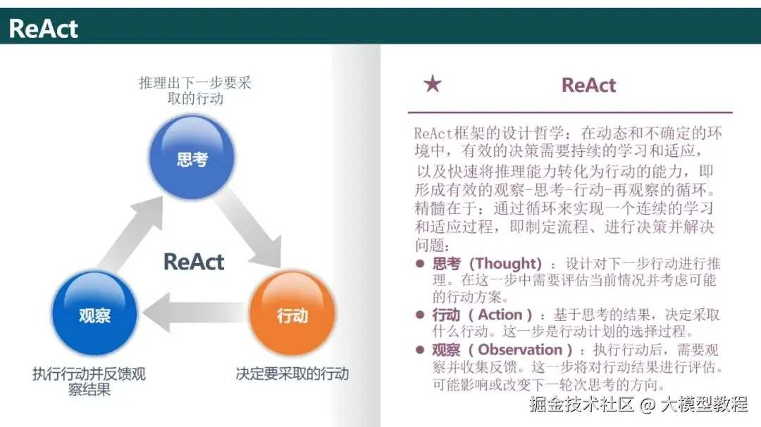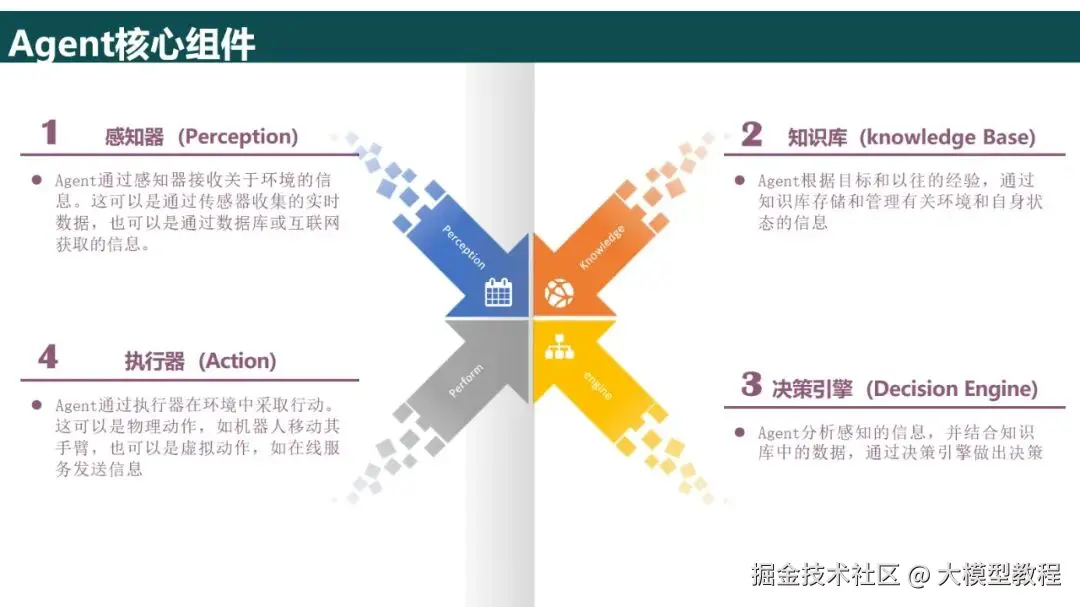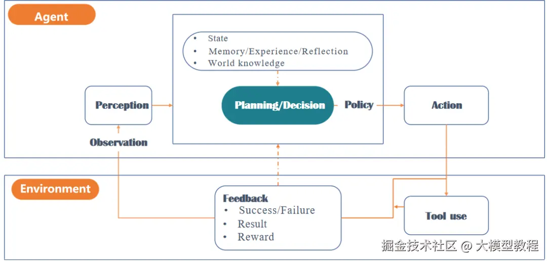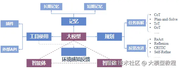 决策模块采用ReAct、CoT等框架进行推理,如客户服务系统的决策过程是"询问用户→获取知识库→给出答案"的递归过程,而对于比较复杂的任务(如工程计划)则采用Plan---and---Execute分解为多个子任务来完成;