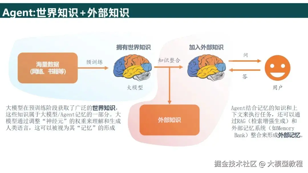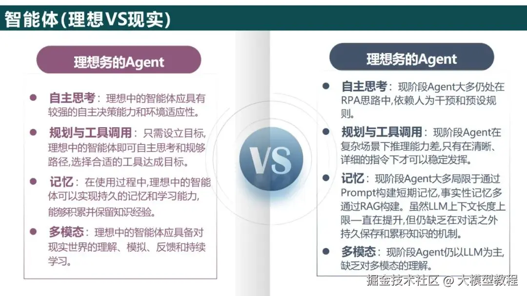 工具层和存储层:工具层集成了API(比如天气和支付接口),代码解释器,记忆存储用RAG 构建外部知识库(解决幻觉问题),而长期记忆可以与Pinecone等向量数据库对接。