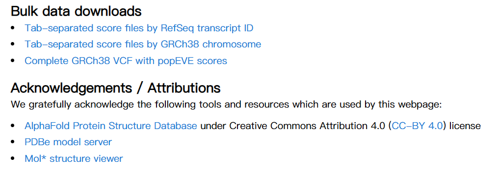 - 完整的 GRCh38 版本 (VCF 格式) ------ 带 popEVE 分数 (VCF with popEVE scores) 。也就是说你可以把整个基因组 /外显子组 (exome) 的变异数据进行注释 /打分。