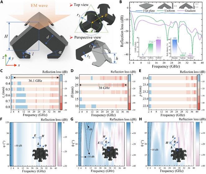 该超结构采用 3D 打印技术制造,核心功能单元选用碳基复合材料(CB-PLA),其优异的介电性能为电磁吸收提供保障。通过精准调控单元壁厚度分布(t₁<t₂),构建梯度有效介电常数剖面,实现从自由空间到损耗材料内部的宽频带阻抗匹配,让电磁波高效进入结构内部被吸收。