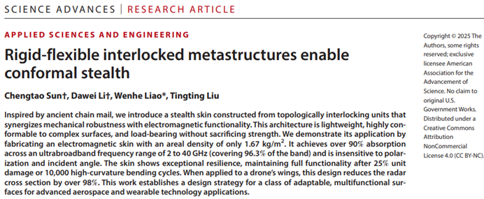 Sun, C., Li, D., Liao, W., & Liu, T. (2025). Rigid-flexible interlocked metastructures enable conformal stealth. Science Advances, 11, eaeb7870.