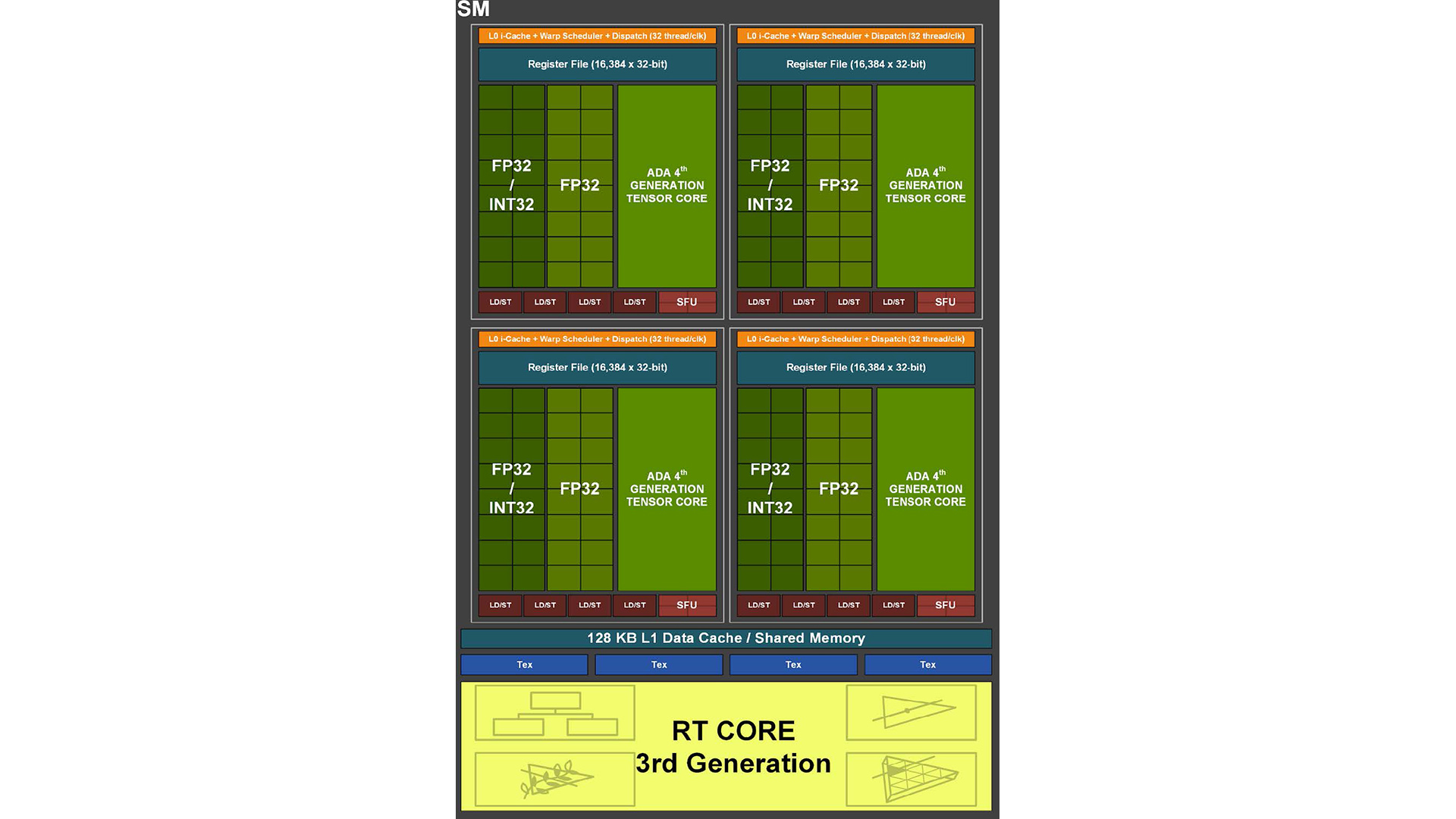 - 流式多处理器(SM,Stream Multiprocessor) :GPU 并行计算的核心单元,也是 Compute Shader 线程的直接执行载体。每个 SM 是一个独立的 "并行计算引擎",包含以下关键组件(以 Ada 架构为例):