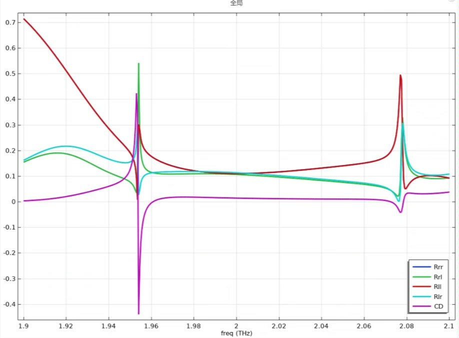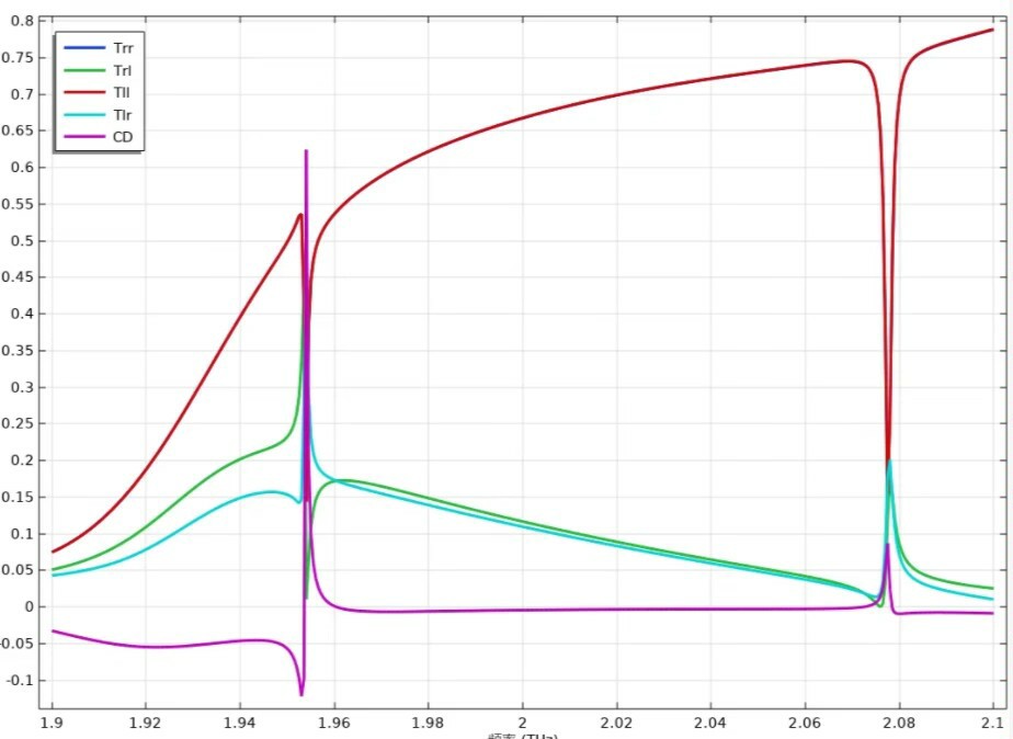 这波操作相当于把透射场的右旋分量拎出来,看看入射左旋波被转化成右旋的比例。参数命名规律看下标顺序:Trl表示入射R出射L?不不,刚好相反,第一个字母是入射极化,第二个是接收极化。这点记混了,仿真结果能差出个数量级。
