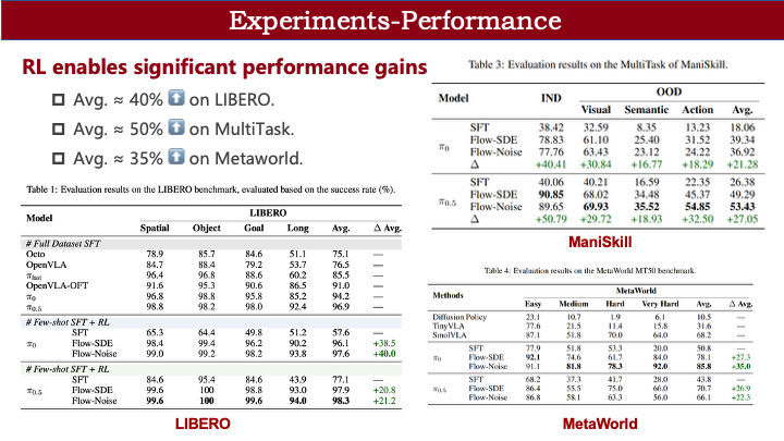 在 CALVIN 长程任务上,SFT 容易因某个子任务失败而卡住(如左下角方块无法推到右侧);RL 后,动作更流畅,整体成功率显著提高。CALVIN 评估包含五个指标:length 1 表示完成第一个子任务的成功率,length 5 表示完成前五个的成功率。