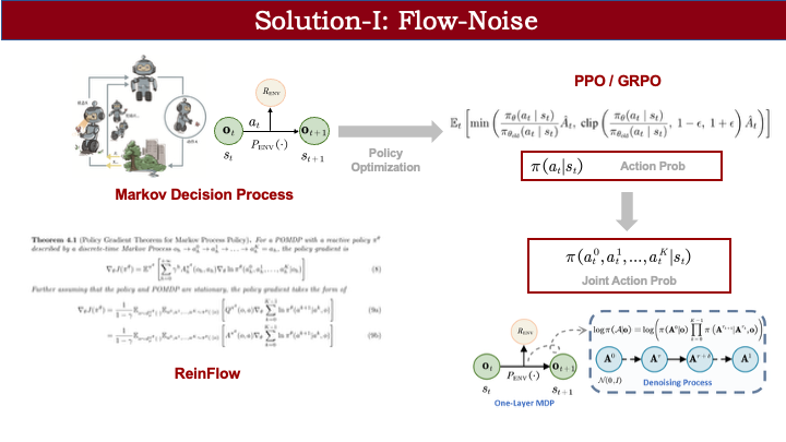 首先介绍 Flow Noise。如前所述,若要用 RL 优化 MDP,必须能计算输出动作的概率。ReinFlow 论文提供了一个思路:虽然 flow matching 模型难以计算边缘动作分布,但可通过联合动作分布来近似替代。我们直接采用了这一理论推导。