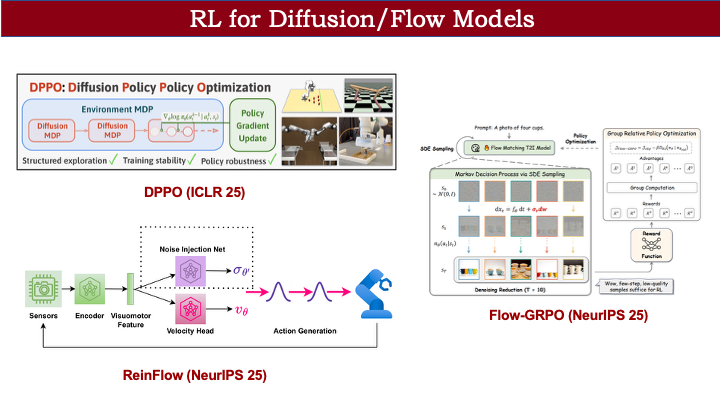 事实上,在 VLA 之外,diffusion 和 flow models 领域已有相关工作尝试解决这些问题。例如 DPPO 解决 diffusion policy 的 RL 问题,RaeinFlow 处理 flow policy 的 RL 问题,Flow-TRPO 则在文生图领域实现了 TRPO 训练。