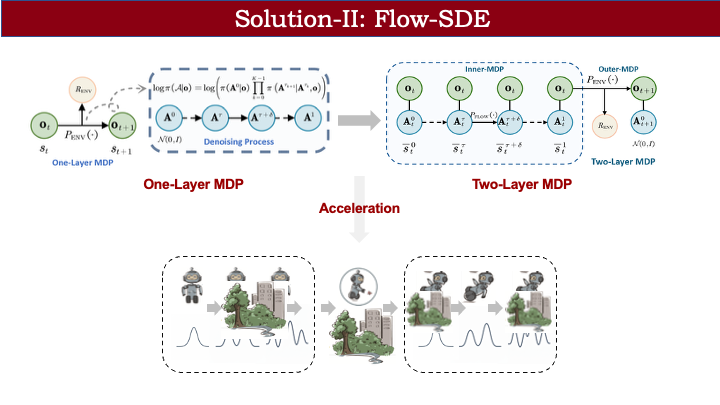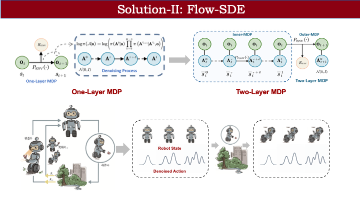 该方案主要基于 ReinFlow 的工作。我们还提出了第二种方案:Flow SDE,它将问题建模为双层马尔可夫决策过程。此前的方法将去噪过程视为动作生成内部的单层 MDP;而 Flow SDE 则将动作生成与环境交互耦合起来。