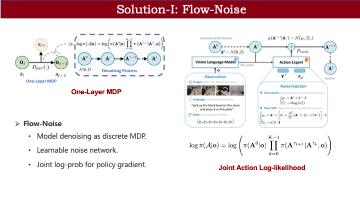 由此,动作被建模为高斯分布,相邻步之间的转移概率即可计算。这就是 Flow Noise 的核心思想:将过程构建为单层 MDP,引入可学习噪声,并利用联合概率密度进行近似策略梯度优化。