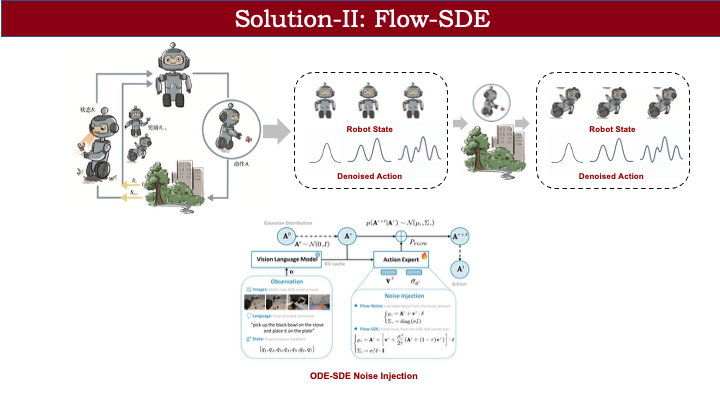 这是第一个问题。第二个问题是:flow matching 本身是基于 ODE 采样的策略,其随机性仅来源于初始注入的噪声,整个流场计算过程是确定性的。这不利于强化学习所需的探索行为。