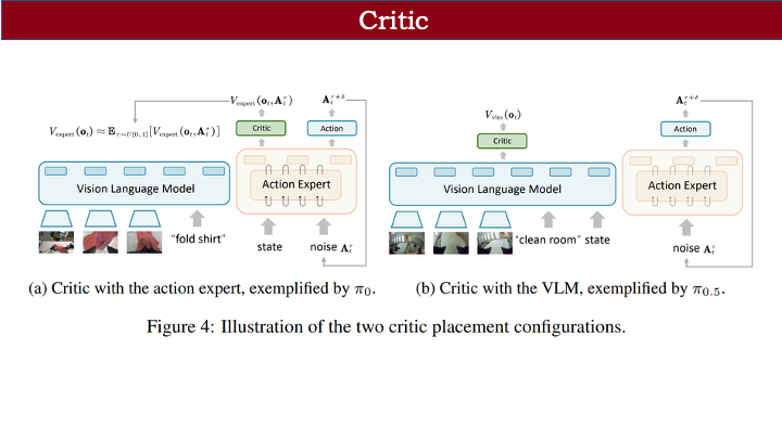 - π-0 则将 state 与动作信息一同输入 action decoder 进行去噪。若将 critic 接在 VLM 前,会丢失 state 信息,因此我们将其接在 action decoder 后。