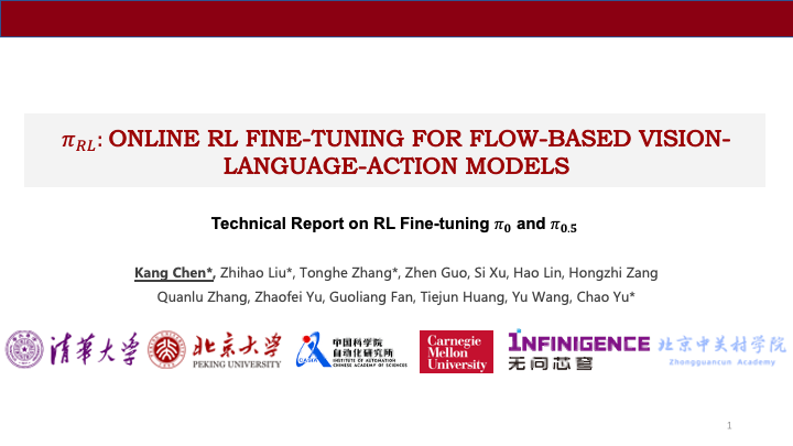 大家上午好!很荣幸能在这里分享我们最近关于 π R L \pi_{RL} πRL :一个面向流匹配 VLA 的强化学习后训练框架的工作。我是北京大学的在读直博生,研究方向是面向 VLA 的强化学习训练。