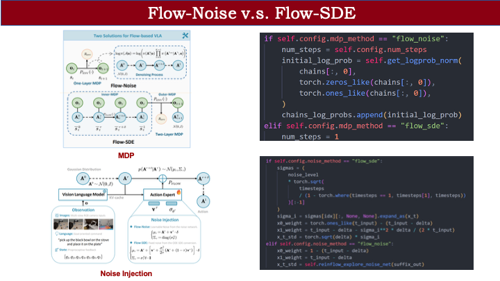 - Flow Noise:需计算完整去噪链的联合概率,包括初始高斯采样概率和每步转移概率。