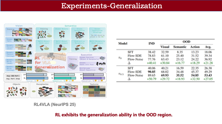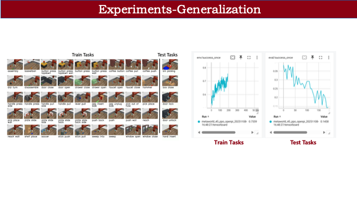 那么,RL 是否意味着 VLA 可实现 zero-shot 泛化?答案是否定的。我们在 Metaworld 上进行了测试:在 45 个任务上进行 RL 训练,另选 5 个完全未见的新类型任务(不同于 ManiSkill 的 pick-place 单一类型)。结果发现,尽管训练任务性能提升,未见任务性能反而下降。这说明 RL 并不具备跨任务泛化能力。